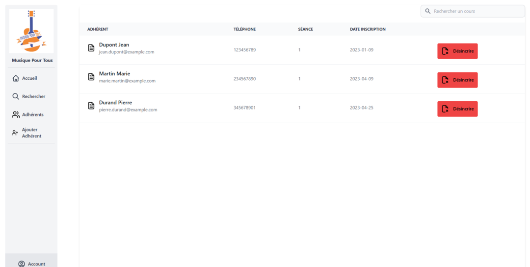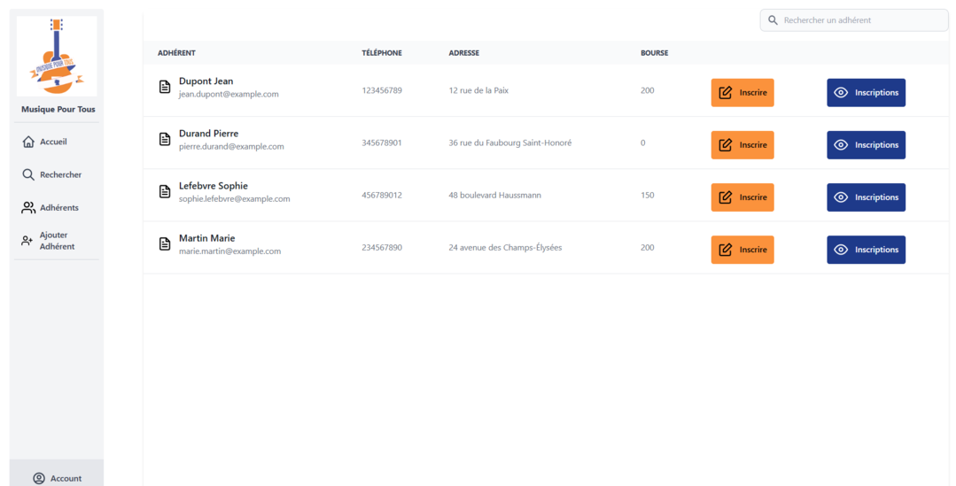inscriptions et une interface professeur qui lui permet d’accéder à la liste d’adhérents à ses