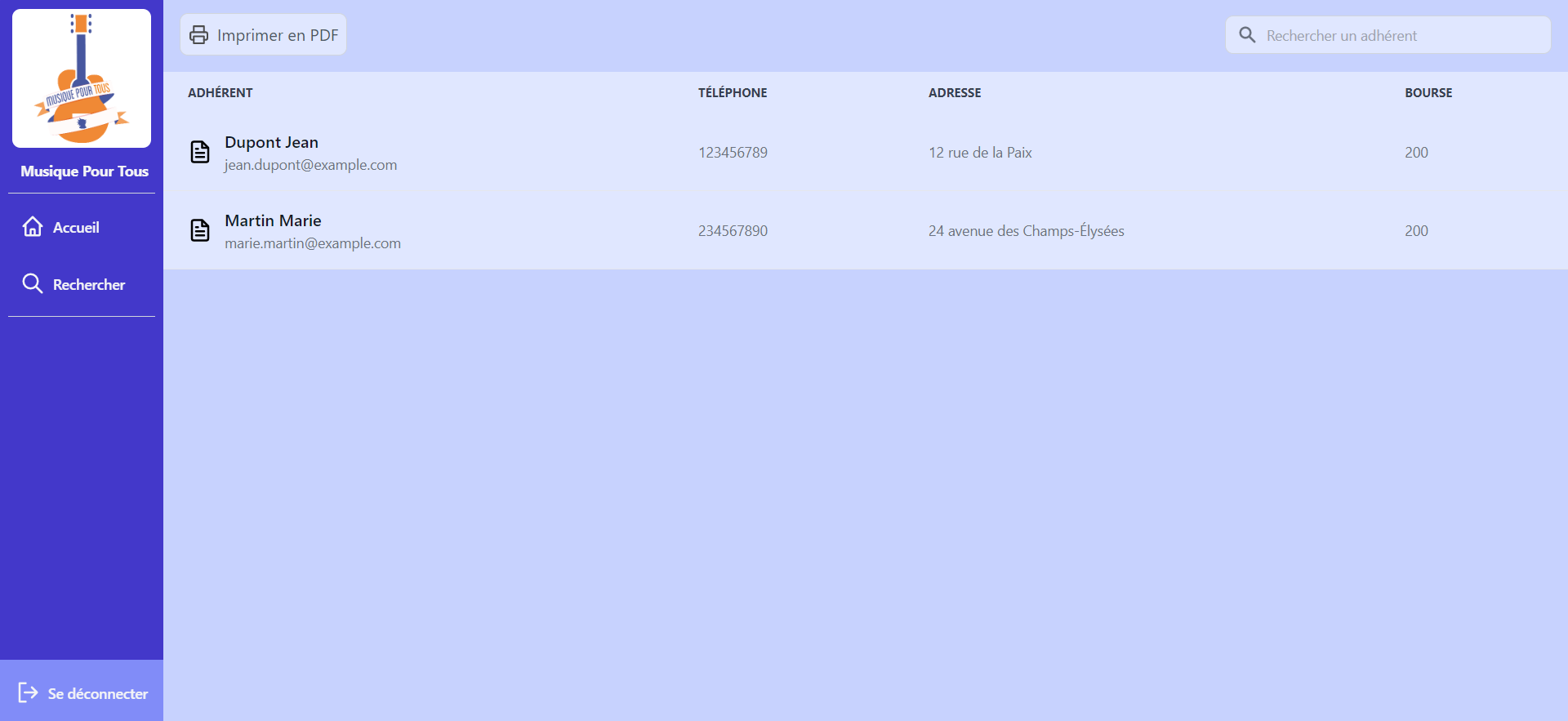 Un bouton "Imprimer en PDF" pour imprimer la liste des adhérents à un cours en pdf.