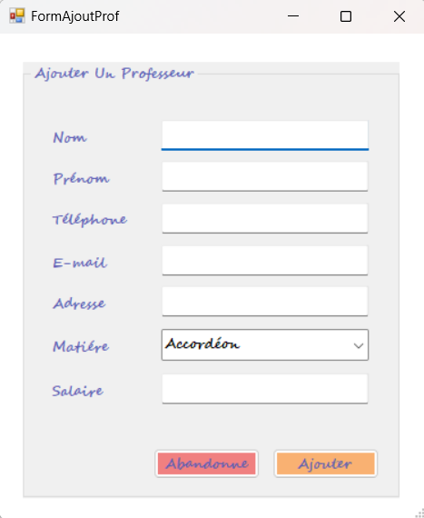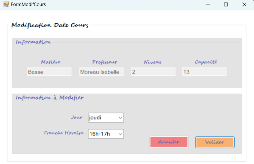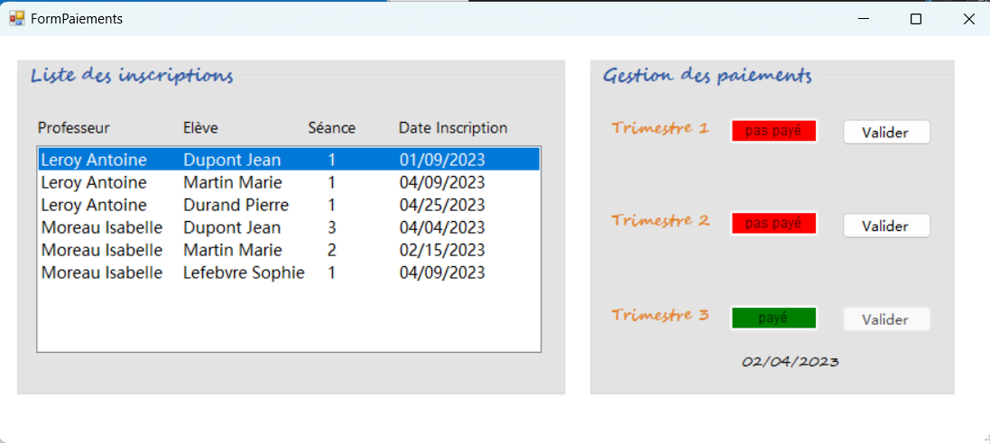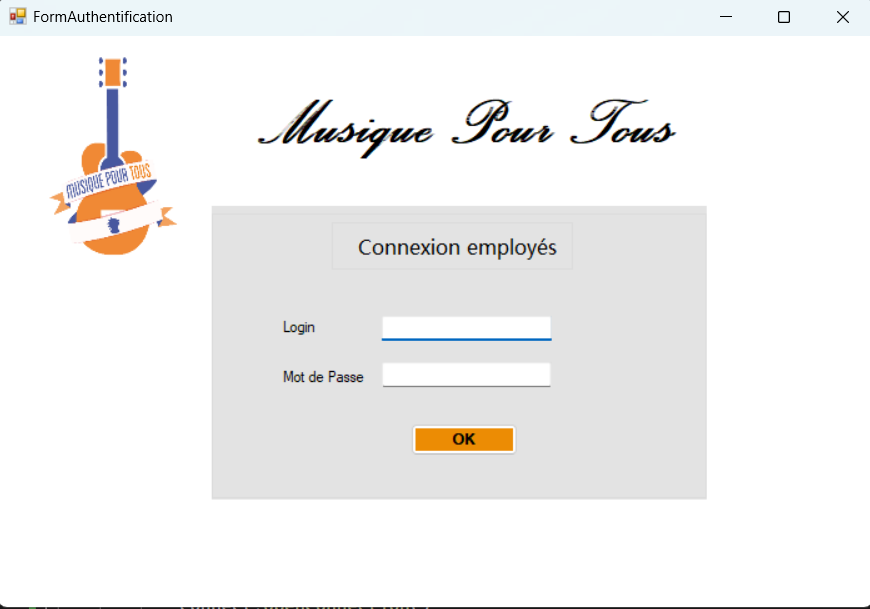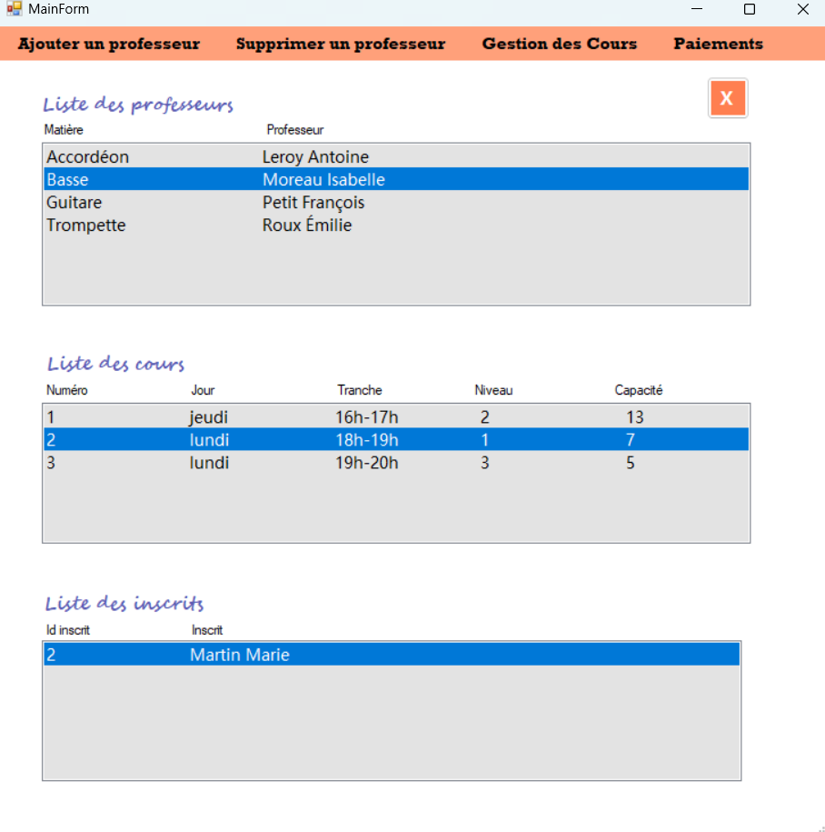 Le conservatoire ‘Musique Pour Tous’ demande la création d’une application de bureau en C# permettant la gestion des cours, la gestion des professeurs et la gestion des paiements. Cette application admet une interface employé leur permettant d’accéder à toutes les fonctionnalités de gestion.